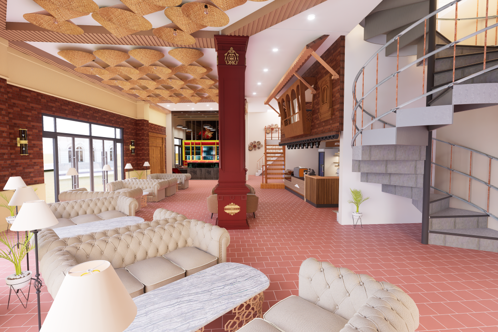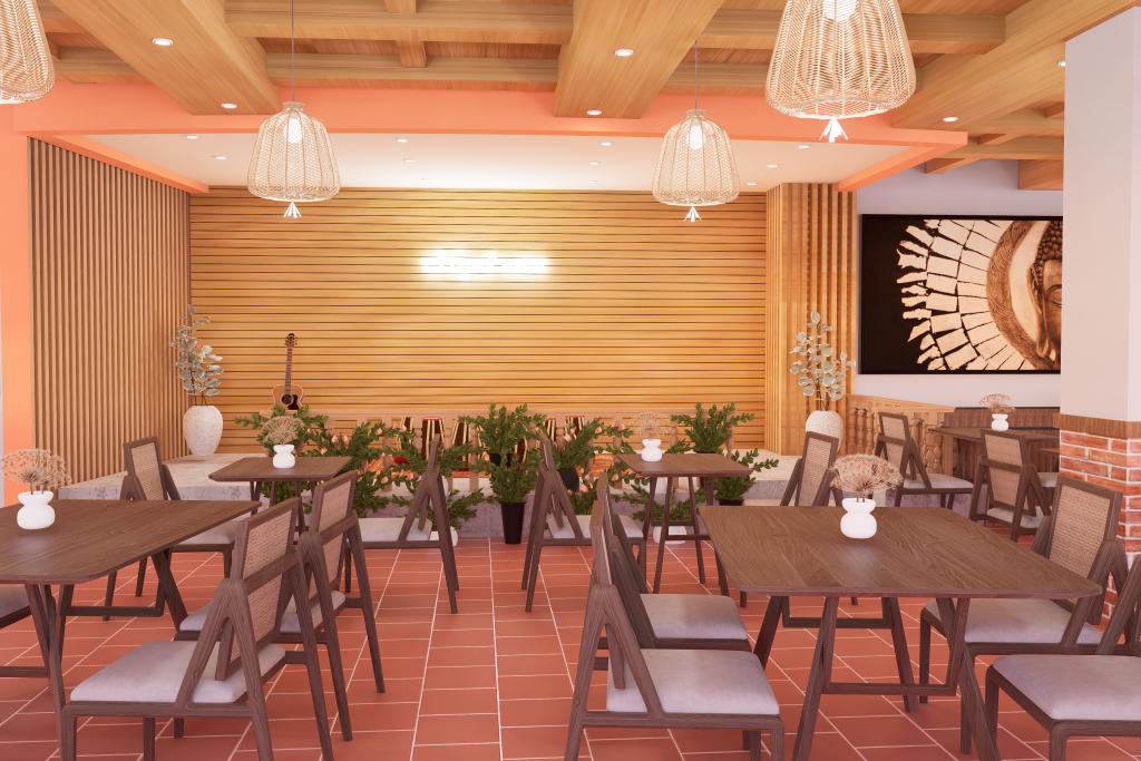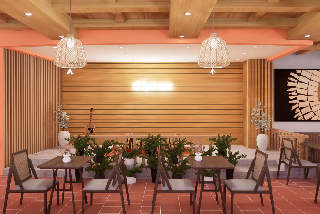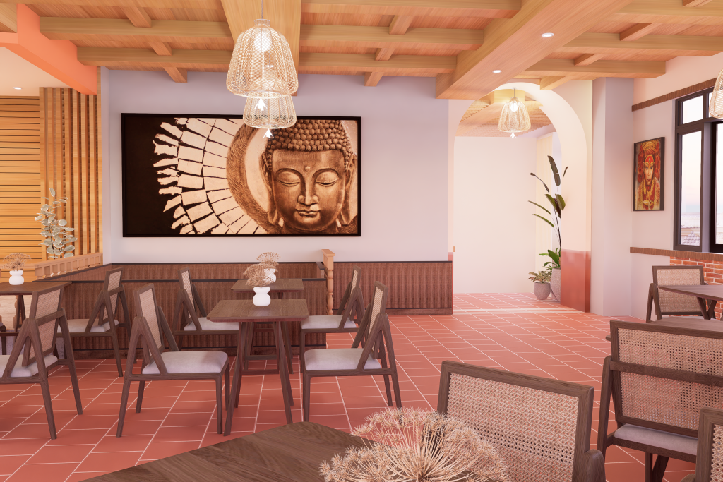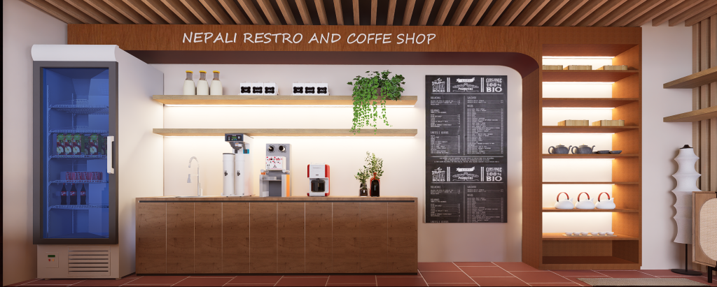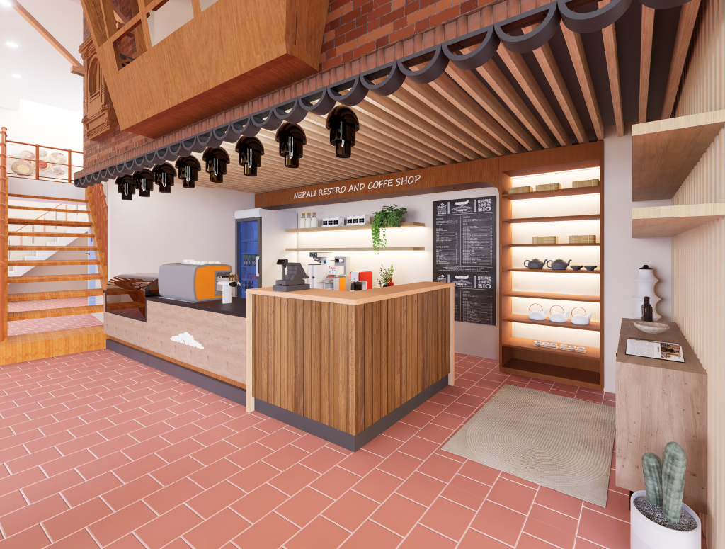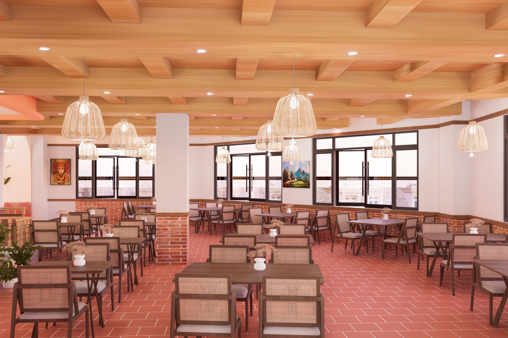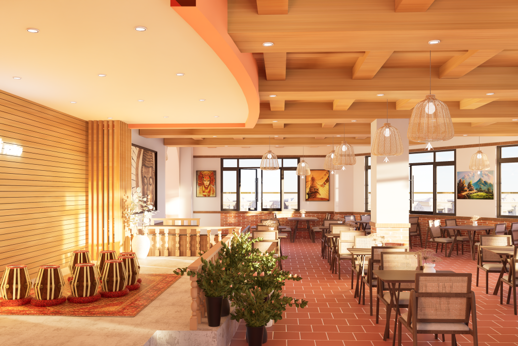 The design blends traditional Nepali elements with a modern commercial layout, creating a warm and welcoming dining experience. Natural textures, earthy tones, and culturally inspired details reflect Nepali identity while complementing the surrounding landscape. Smart space planning ensures smooth circulation, efficient seating, and an inviting ambiance suitable for both locals and tourists.